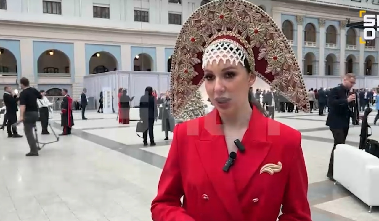 Журналистка из Нижнего Новгорода в традиционном русском наряде планирует задать вопрос