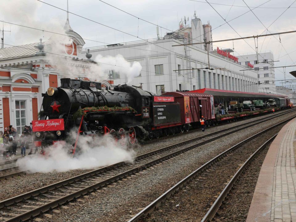 Во главе состава будут сразу два паровоза серии Л, шесть платформ с военной техникой, два вагона-теплушки с полевой кухней. Торжественный состав отправится в поездку по ГЖД в 9:00 — запланировано 30 остановок.