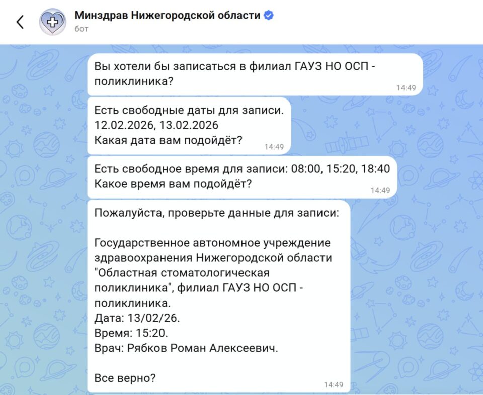 Региональное министерство здравоохранения и Нижегородская областная стоматология разработали чат-бот, через которой можно записаться на прием к специалисту. Пациент может выбрать удобный филиал, дату и время записи.