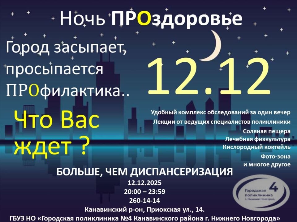Ночная диспансеризация будет организована для пациентов городской поликлиники №4. Нижегородцы, которые не могут отпроситься с работы, смогут проверить здоровье в вечернее время. 12 декабря с 20.00 до 23.59 двери медицинского учреждения будут для них открыты.