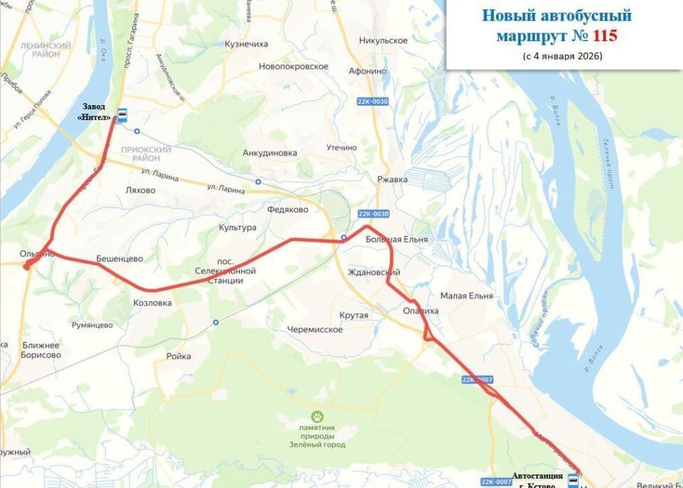 С 4 января автобусы №115 начнут ходить от завода «Нител» в Приокском районе Нижнего Новгорода до автостанции Кстово через деревню Опалиха, поселок Ждановский, ТЦ «Мега», деревню Федяково, село Большая Ельня, поселки Культура и Селекционной станции, деревни Козловка, Бешенцево, Ольгино.