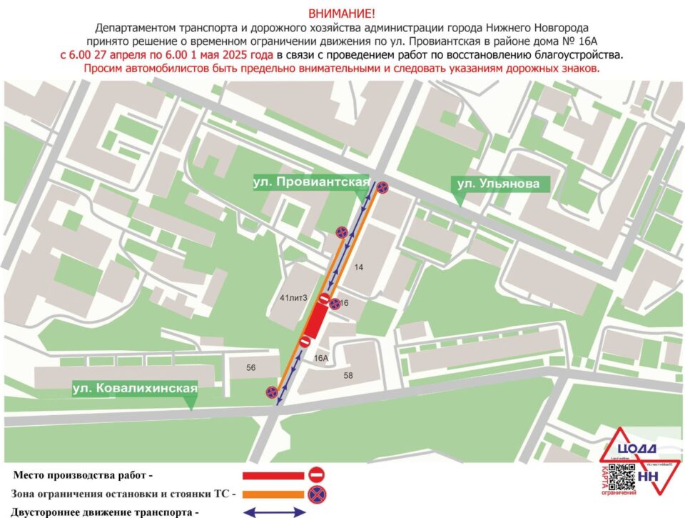 Ограничения будут действовать с 6:00 27 апреля до 6:00 1 мая на участке у дома №16А. По Провиантской на участке от Ковалихинской до Ульянова будет организовано двустороннее движение.
