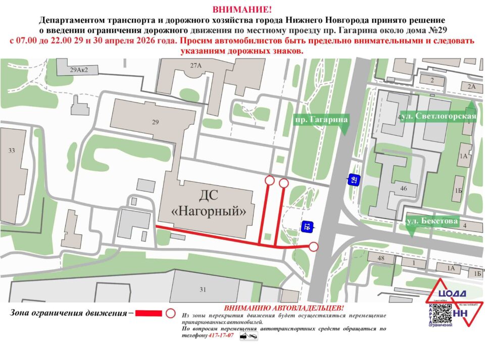 В Нижнем Новгороде 29 и 30 апреля ограничат движение транспорта по местному проезду проспекта Гагарина у Дворца спорта. Об этом предупредили в пресс-службе городской администрации.