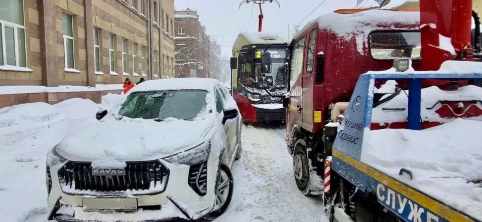 Через 25 минут мэр сообщил, что эвакуаторы забрали сразу три машины. Движение трамваев восстановлено.