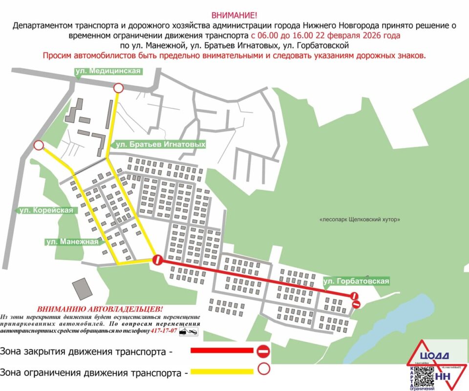 Проезд временно закроют на улицах Манежной ( на участке от улицы Корейской), Братьев Игнатовых ( от улицы Медицинской) и Горбатовской. Ограничения будут действовать с 06:00 до 22:00.