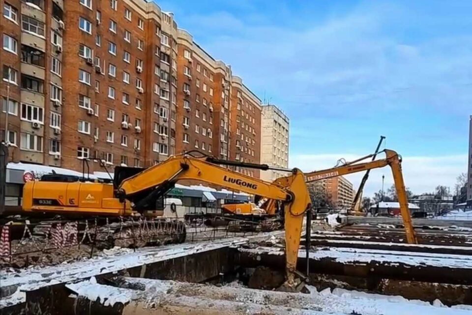 На строительной площадке разрабатывают грунт и ведут подготовку распорной системы для укрепления стен котлована.